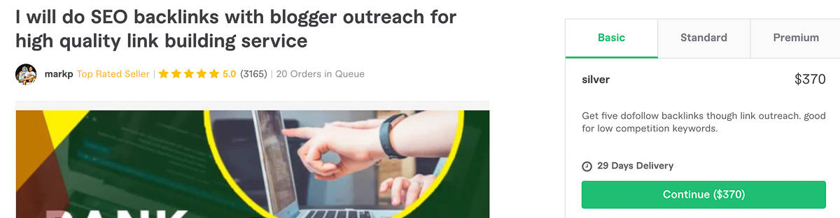 Let’s say the client is interested in building backlinks for this specific example. Prices from top sellers go from $200 to $800, depending on the number of backlinks required.