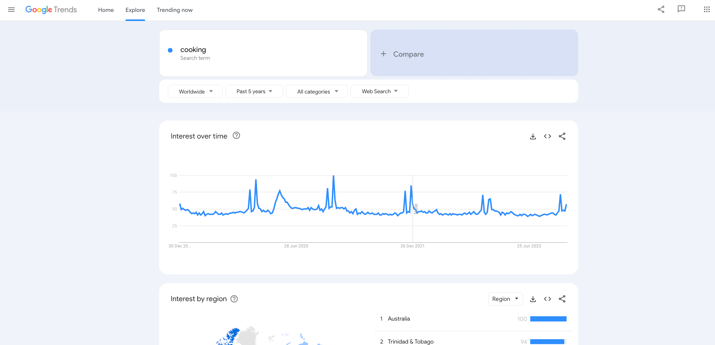 The Google Trends graph illustrates a steadily rising interest in plant-based diets and vegan lifestyles. This niche has seen a significant uptick in popularity, reflecting a growing global consciousness about health and sustainability.