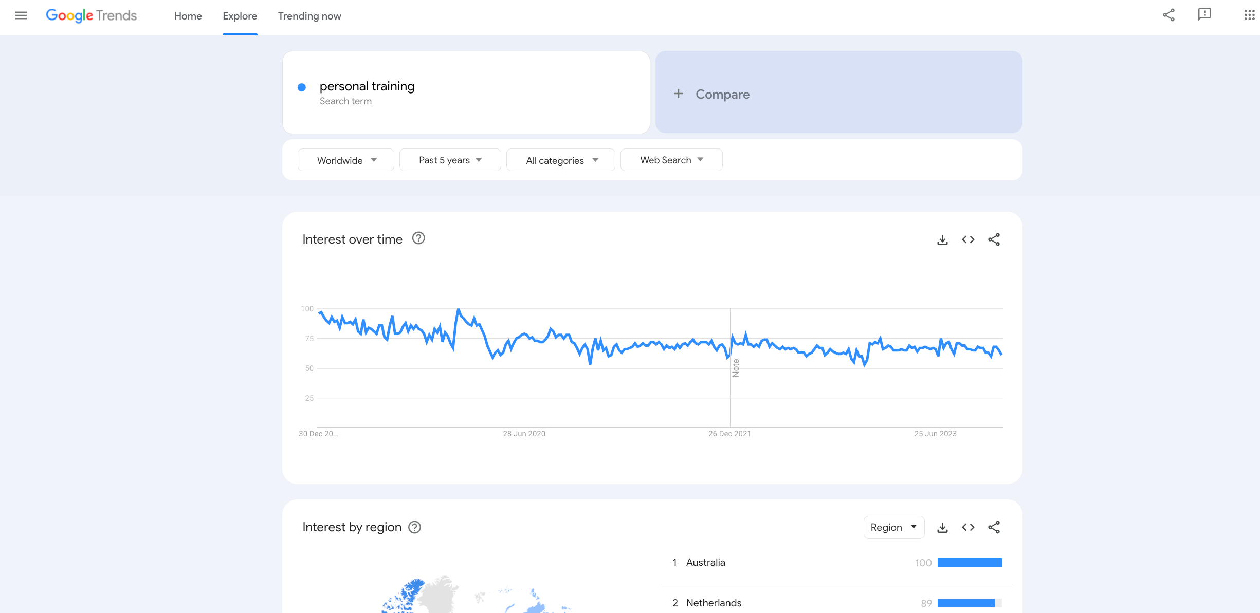 Fitness and Personal Training show a dynamic trend with periodic peaks, likely aligning with New Year resolutions and seasonal fitness interests, indicating an ongoing and cyclical engagement in this niche.