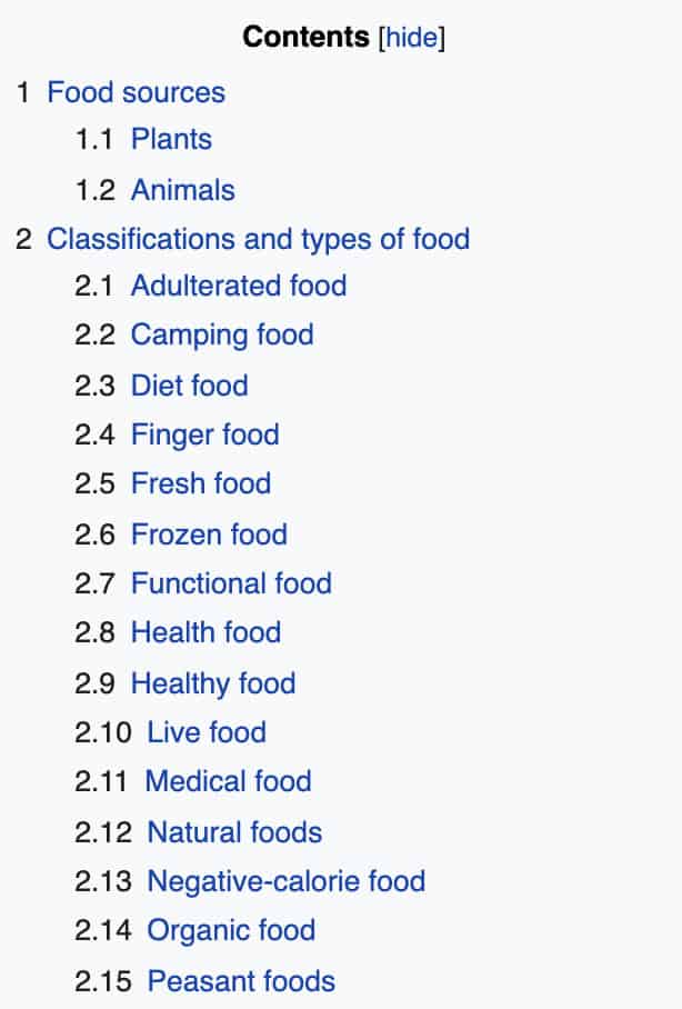 Step #2. Skim the page for sub-niche ideas. You’ll be able to find plenty of food-related keywords along with the Wikipedia page.