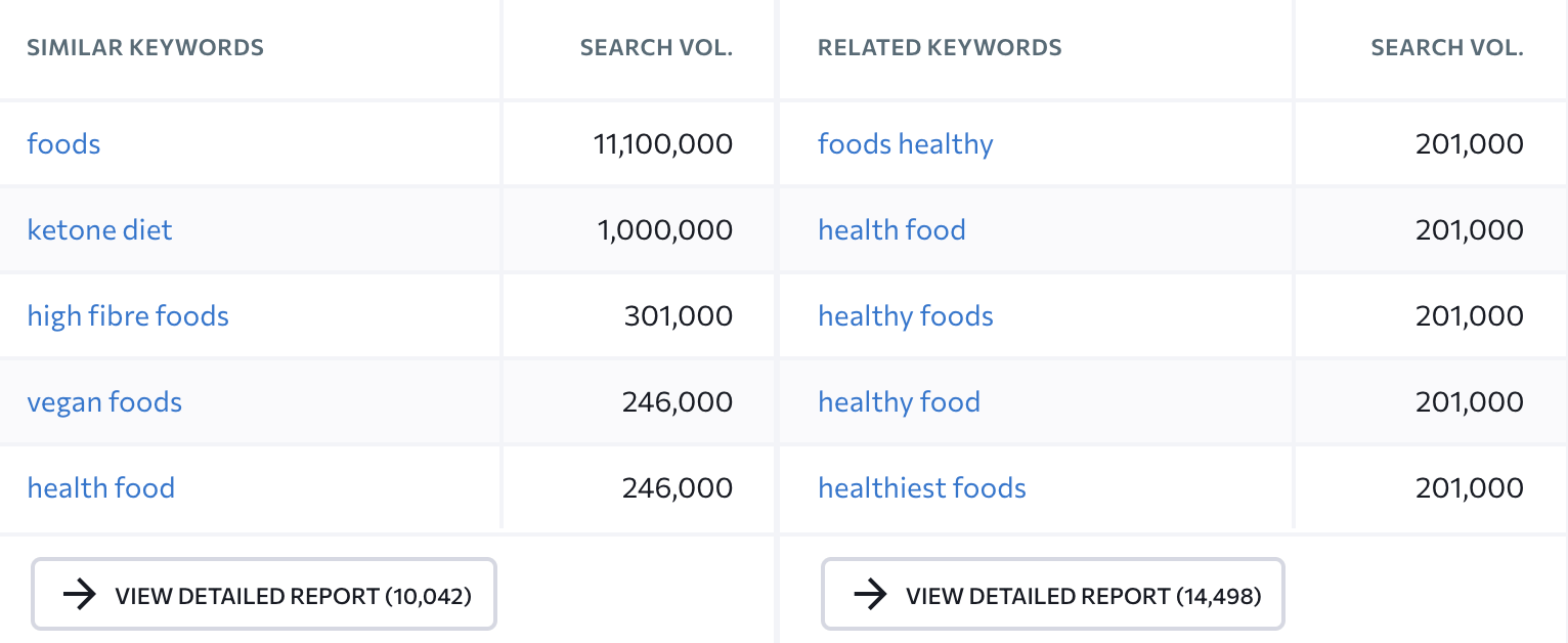 Step #2. Scroll down to the section keyword ideas. Here, either the similar keywords report or related keywords report will do the trick. So you can click on ‘View Detailed Report‘ on either. For this example, I have clicked on related keywords.