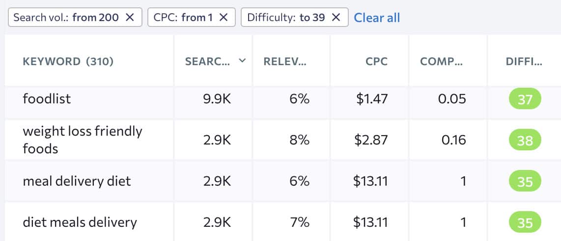 Looking at this example and the keywords found, I am confident I could create a niche website about diet food with less competitive terms. Then I could monetize it with sponsored content, ads, subscriptions or, even affiliate marketing.