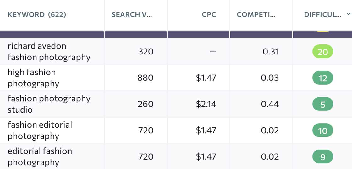 Step #4. Now I have a list with 622 keywords filtered by difficulty. Although you could also filter them by difficulty or any other value you want.