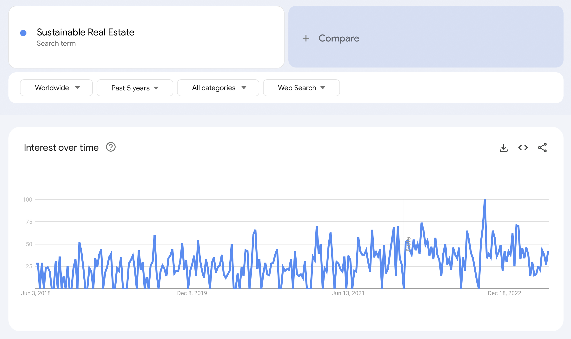 Step #4. Lastly, use Google Trends to validate your niche idea. For this example, I will check “sustainable real estate,” which I found on Wikipedia.
