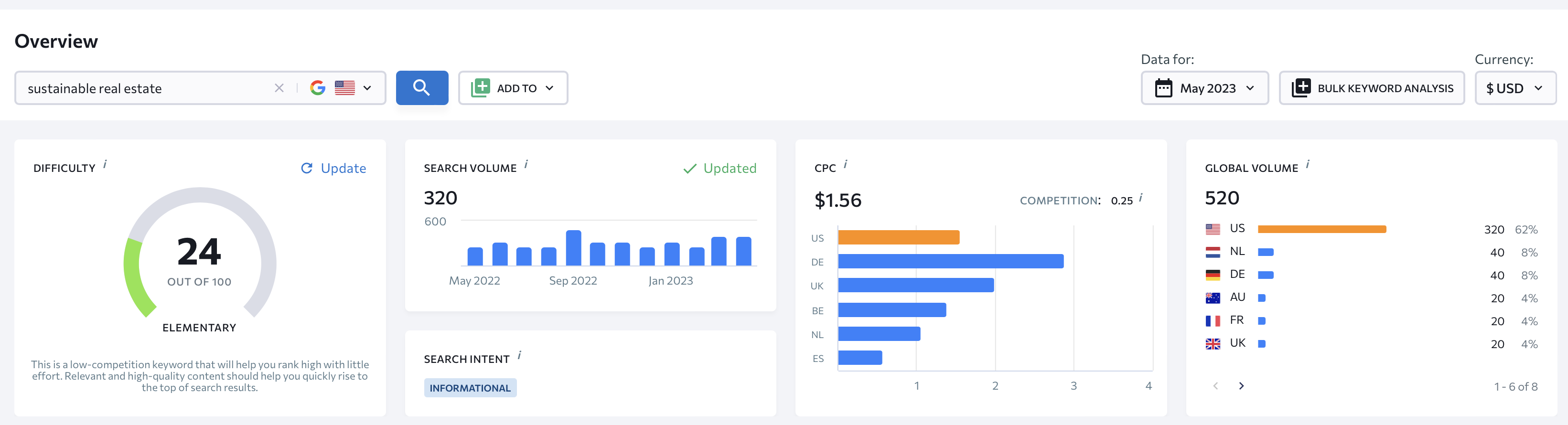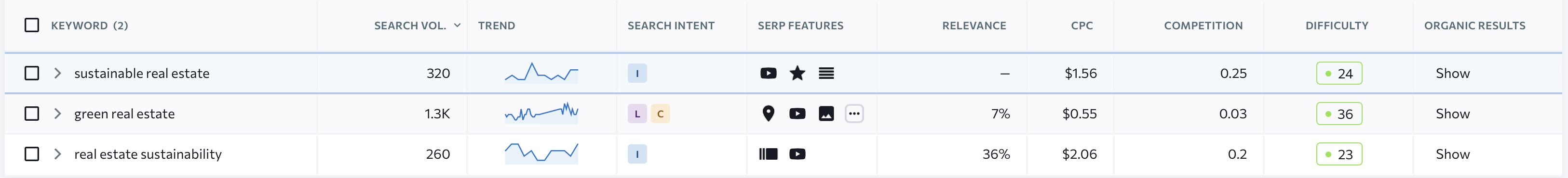 For this example, I will check the competence for the previous keyword we found, “sustainable real estate.”