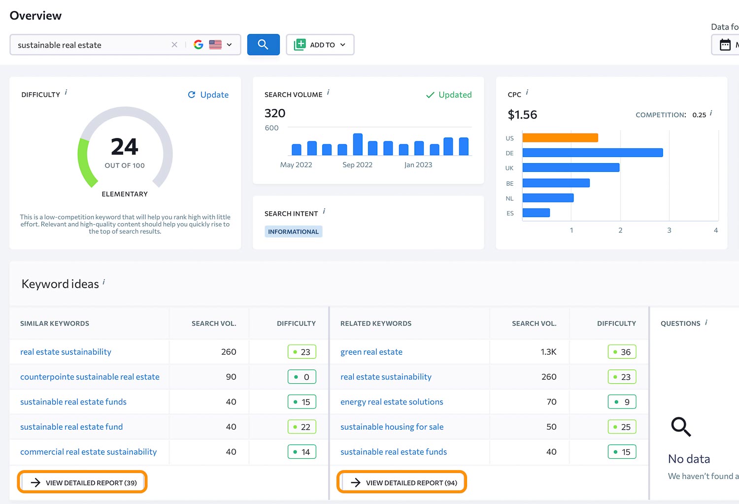 Step #2. If you are using SE ranking, you just need to click on either “View detailed report” under similar keywords or related keywords. Just ensure you check both to find more.