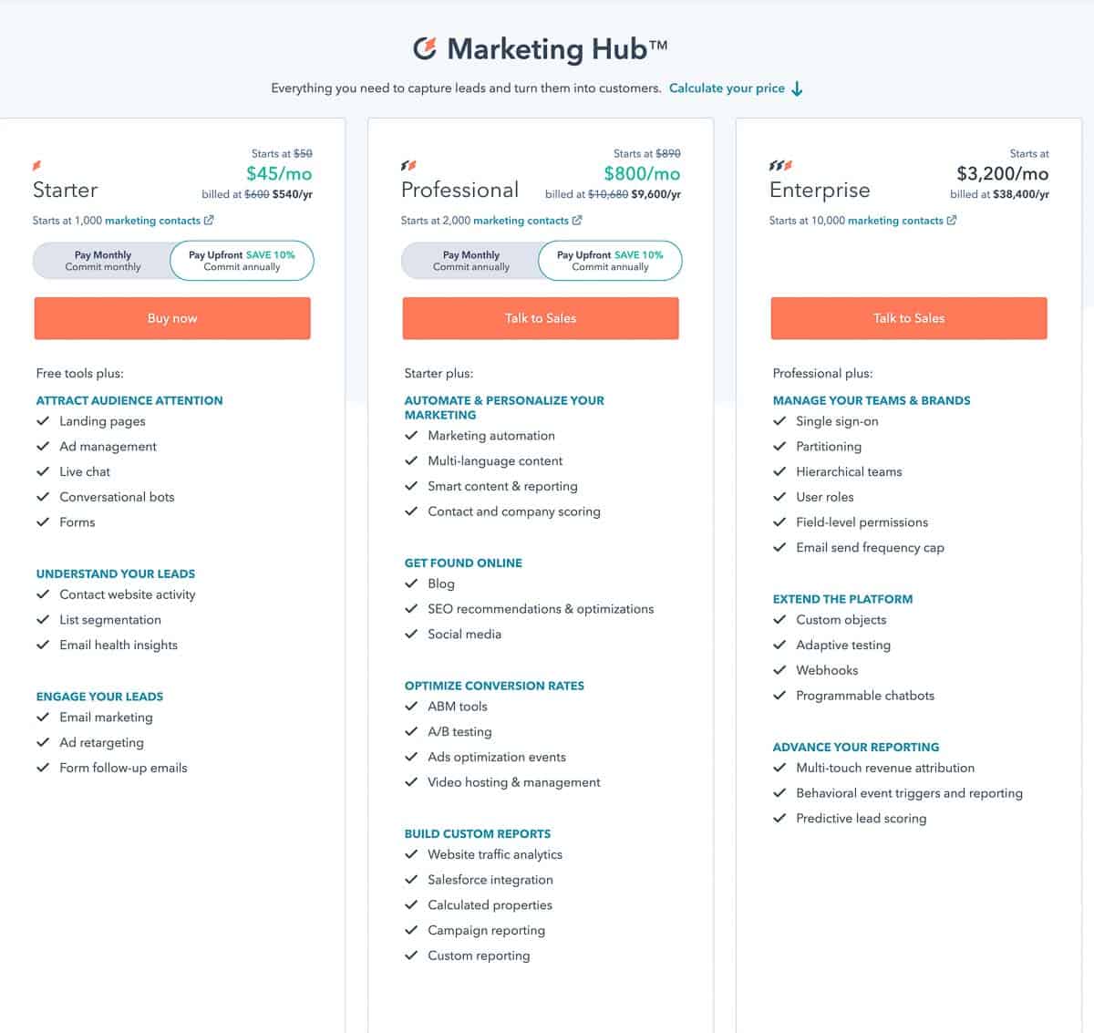 When it comes to Hubspot pricing, there are four types of licenses to purchase that apply to marketing, sales, and service. The free rate is the most basic and includes the Hubspot CRM; Starter is intended for small businesses that do not have much budget.