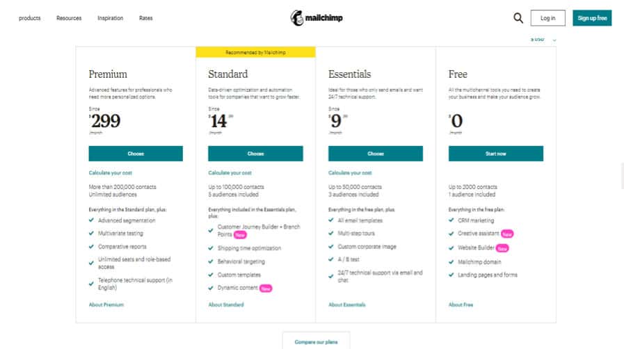When comparing prices, MailChimp offers four much more affordable plans than Hubspot. These are the Premium, Standard, Essentials, and Free plans, which are especially useful for small businesses. They offer options that adapt to marketing needs and perhaps even useful for projects such as social media management.