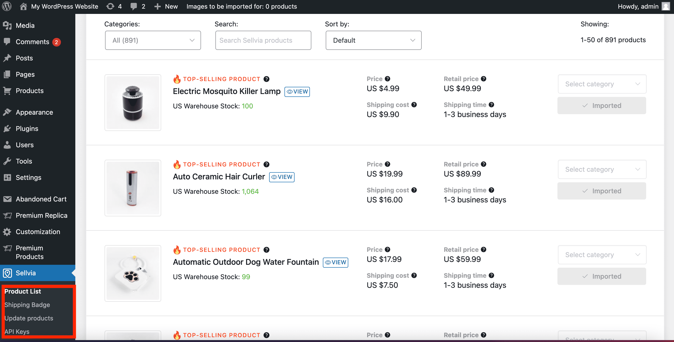 Once the plugin is activated, you can import Sellvia products and send your orders to their US warehouse.